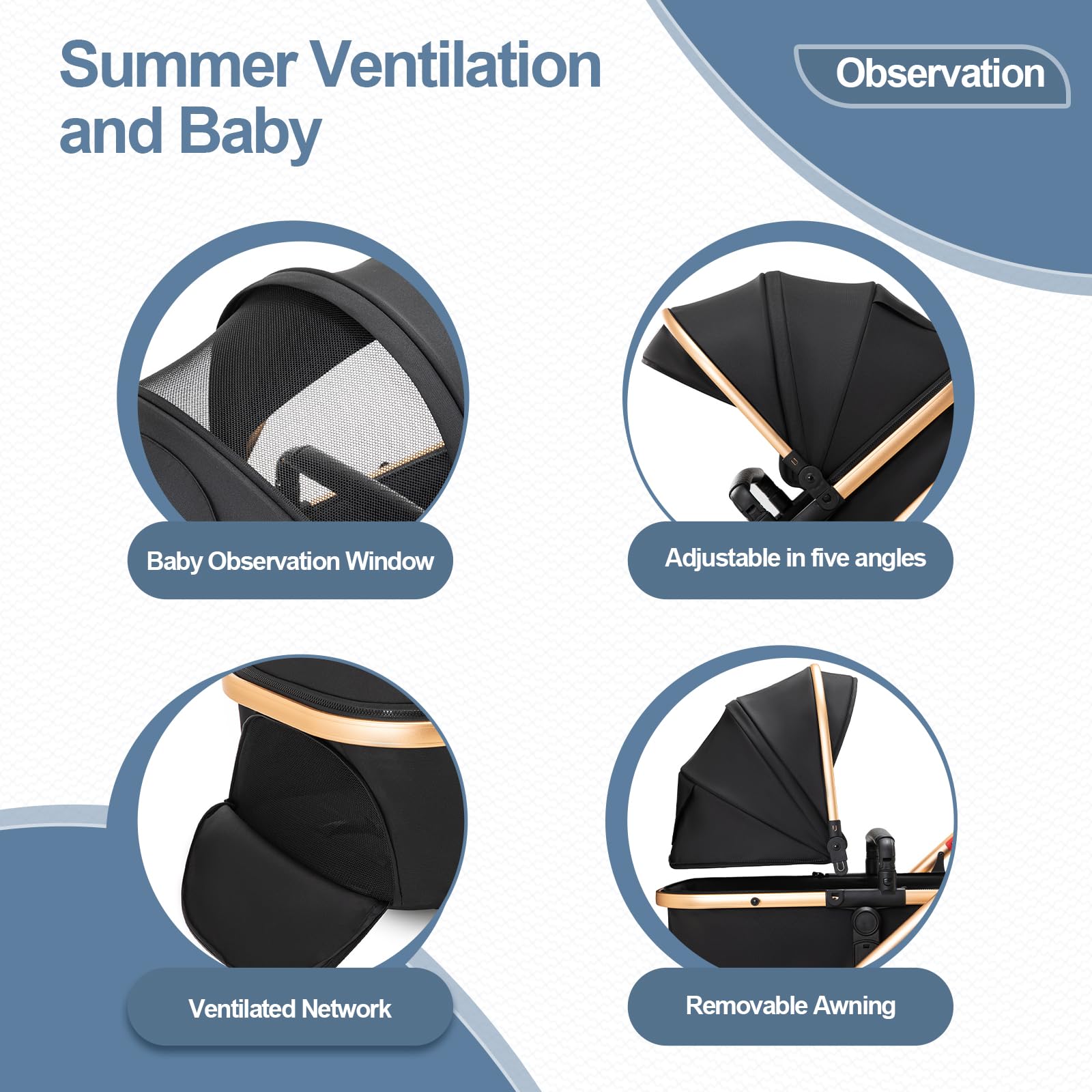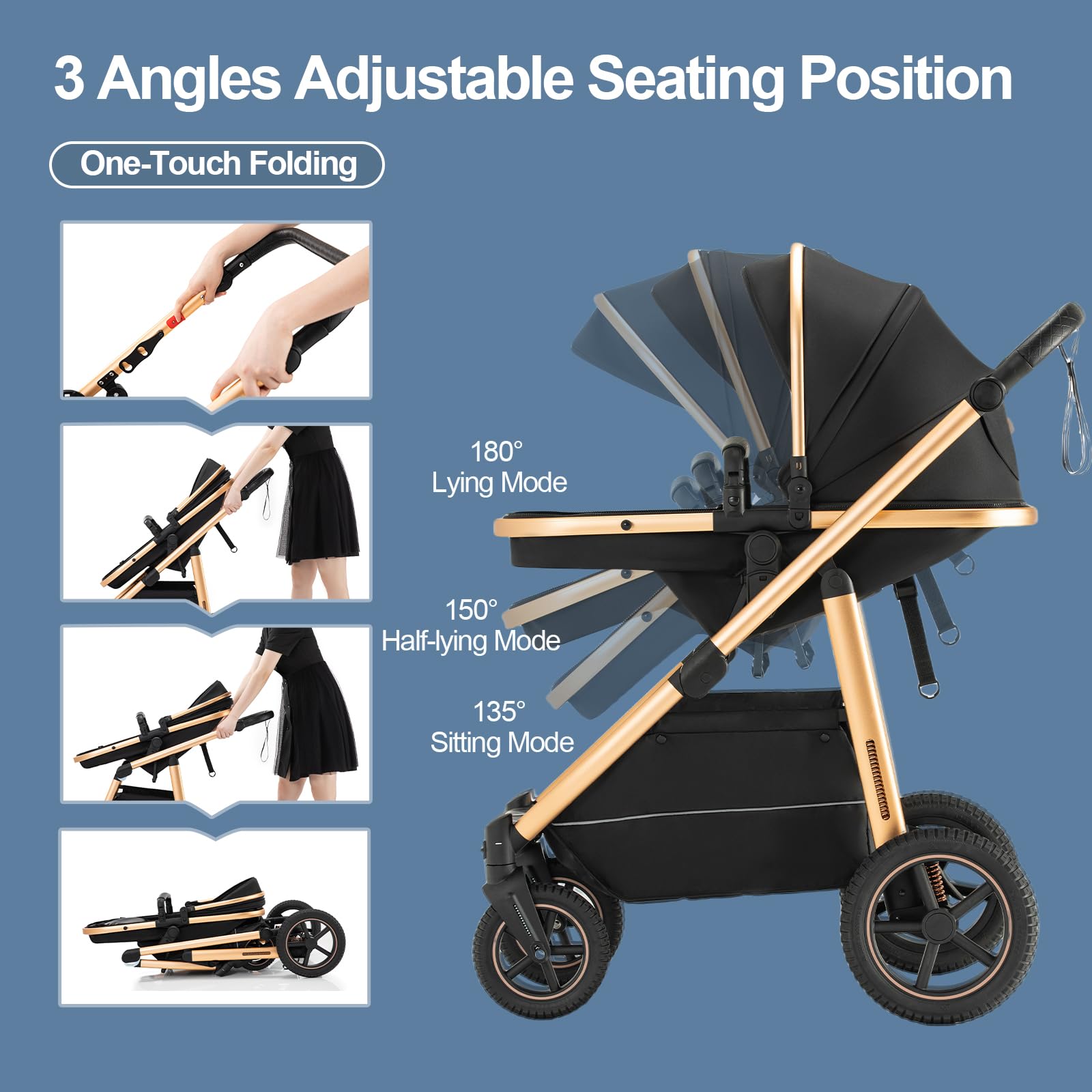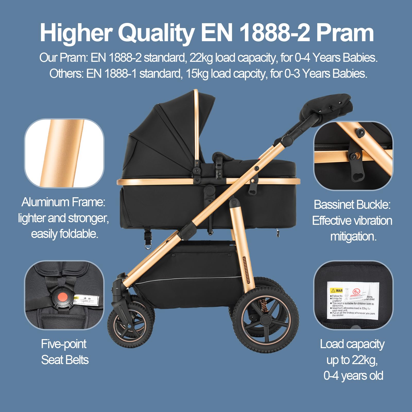 Gcarebb 3 in 1 Prams Travel System, Pushchair with Height Adjustable Handle, Travel Pram with Rain Cover, Baby Stroller with Aluminum Frame for Newborn 0-4 Years